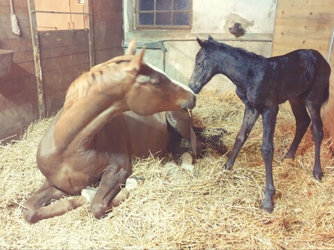 30 Tage nach dem geplanten Abfohltermin überrascht uns unsere Mohnblüte am Karfreitag, 19.04.2019 mit einem wunderschönen For Romance I Hengtstfohlen in schwarzer Jacke …